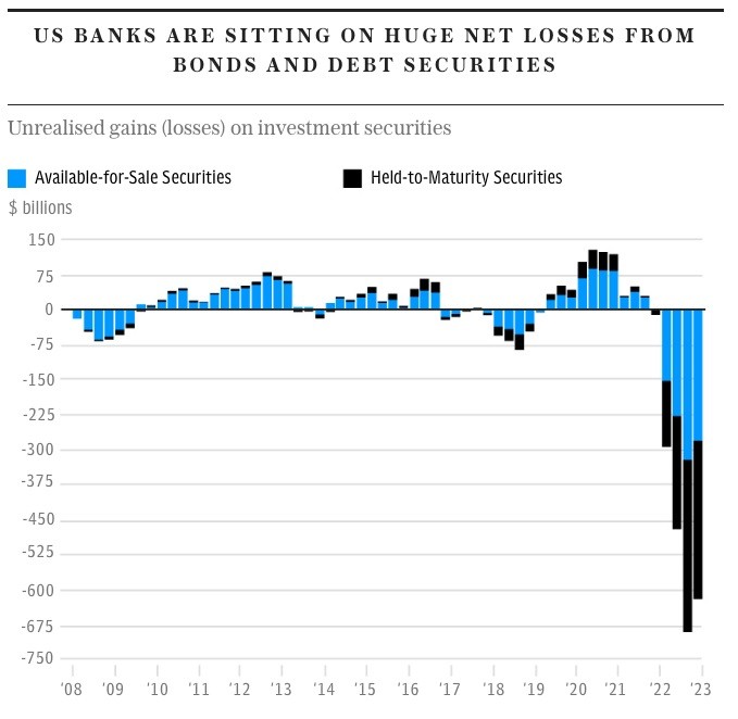 The European banking sector is in an even worse state than the US one. European banks are sitting on large losses from bond portfolios acquired when interest rates were negative. No one knows at this stage the magnitude of the losses which are likely to be substantial.