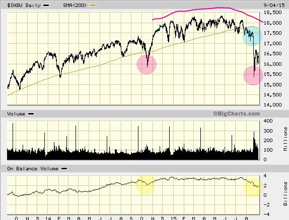 - The DJ Industrials’ fall to a lower low than October 2014 was confirmed by Transports fall to a lower low (Pink spots)
