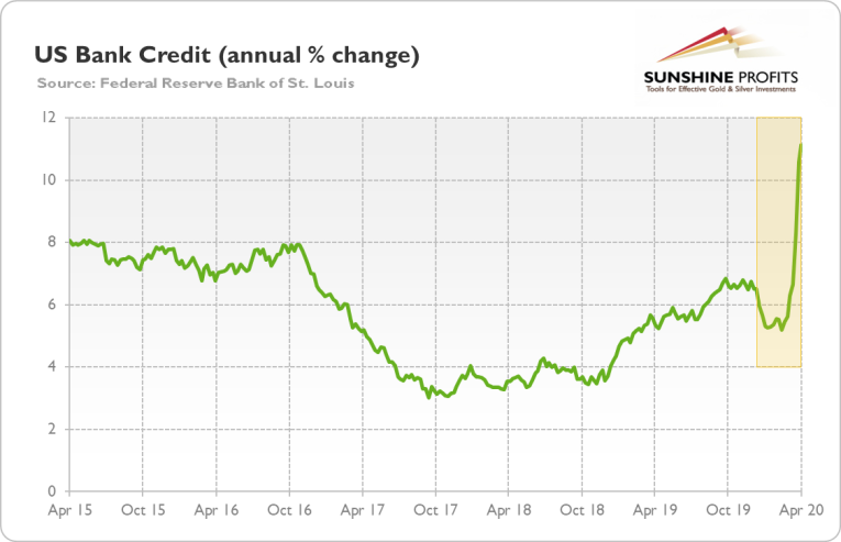 Moreover, the commercial banks are relatively healthy this time, which means that they are able to extend credit. Please note that this is the core of all emergency programs introduced by the Fed and other central banks all over the world. They encourage commercial banks to grant new loans to companies that have suffered as a result of the coronavirus crisis and social distancing. As the chart below shows, the credit supply in the US has accelerated in March.
