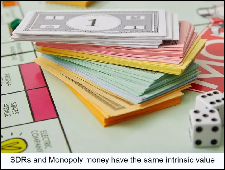 Meanwhile, Biden and his commie friends can gin up as many SDRs as they want and it’s not going to change things significantly. Think of it as a game of Monopoly in which a splinter group called Park Place LLP is formed to generate side-action with $1,000 worth of scrip. That’s only about 5% of what the official bank holds, but because it is not nearly as leverageable or fungible as "real" Monopoly dollars, the partners will eventually fritter away their "SDRs" paying hotel rents, utility bills and jail fines. Similarly, players who are dealt Biden SDRs will be constrained from multiplying them in the way a single real dollar magically becomes 50.
