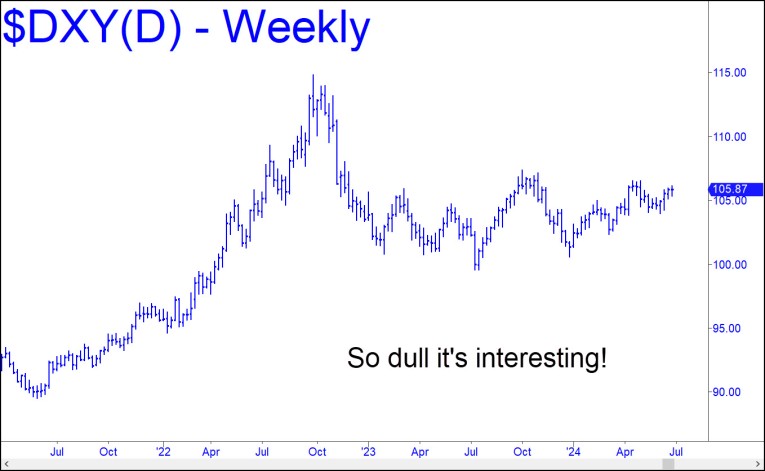 Of all the markets tracked by Rick’s Picks, the dollar arguably has been the most interesting. This might seem paradoxical, given the relatively placid look of the Dollar Index chart above. Although there has been moderate turbulence since early last year, the overall impression is of a transoceanic flight cruising within a vertical range of several thousand feet. Most striking has been the dollar’s ability to hold aloft a mere 4% below 2022’s peak of around 115. This is tough to square with apparent reality, since the greenback’s global hegemony for the last 90 years has come under increasing challenge — from the BRICs, for one: Brazil, Russia, India, China, South Africa, Iran, Egypt, Ethiopia, and the United Arab Emirates. It were as though they had ganged up on the schoolyard bully, changing the way international trade in goods and commodities is settled so that dollars are disfavored in every meaningful way possible. Most recently, the Saudis announced with some fanfare that they would sell as much oil as demanded of them for payment other than in dollars. As the chart makes clear, however, if this had any discernible impact on greenbacks, it was to have caused their slight rise. Why the seemingly anomalous behavior?