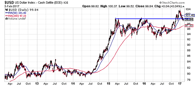 The US Dollar Index has fallen below the psychological 100 level, while 2-year and 10-year US Treasury yields remain above multi-year support levels. This is despite the Federal Open Market Committee keeping the Federal Funds rate steady at 0.75% on Feb 1, 2017.