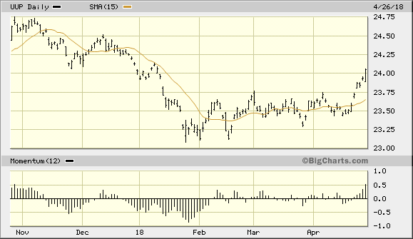 A pullback in the 10 Year Treasury Yield Index (TNX) on Thursday after reaching the widely feared 3.0% level earlier this week was one catalyst in gold’s recent underperformance. The fact that U.S. bond yields finally snapped a 6-day rally allowed equity investors to breathe a collective sigh of relief. That, coupled with a slew of positive earnings reports from major companies, including Facebook (FB) and Advanced Micro Devices (AMD), pushed the major U.S. stock market averages higher for the day. This only served to further undermine safe-haven demand for gold as investors showed greater interest in riskier assets.