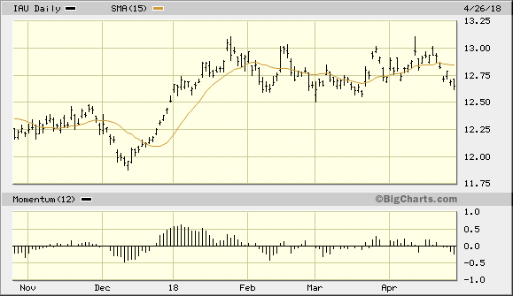 Meanwhile, I continue to recommend that short-term traders remain in cash after the latest whipsaw in the gold price. We exited a conservative trading position in the iShares Gold Trust (IAU), below, on Monday after our technical trading discipline confirmed an exit signal. IAU remains below its 15-day moving average but is still above the $12.50 level – the lower boundary of a 3-month trading range.