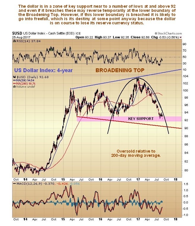 On the long-term 20-year chart for the dollar index we can see that it is still at a fairly high level after its gains during 2014 and 2015, but appears to be marking out a “Broadening Top” pattern. On this chart we can also see that if it proceeds to fall hard soon, it won’t be the 1st time – it suffered a brutal decline between the start of 2002 and early 2008 – and that was before it was threatened with the loss of its reserve currency status, so the looming bear market could clearly be much, much worse.