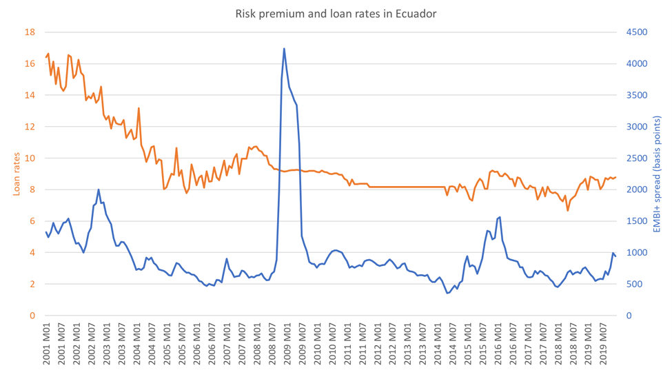 The difference in inflation is significant, but that’s not the only benefit. Dollarization also helps insulate private credit markets from sovereign default. Ecuador defaulted on its sovereign debt in 2008. Unsurprisingly, its country-risk premium increased considerably. In other countries, fears of debt monetization might have caused private sector credit to contract as well. But not in Ecuador. Since Ecuador was dollarized, private sector credit remained largely unaffected by the default. As the following figure shows, the spike in the country-risk premium (blue line) did not push up loan rates in Ecuador.