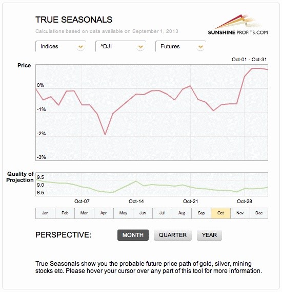 Taking a look at the True Seasonal patterns for the stock market reveals that the situation has been developing quite in tune with them this year. We saw a correction at the beginning of October which was followed by a sharp move back up. The rally now continues. What’s next? Please note that there are no clear short-term indications from the seasonality and derivatives’ expiration effect (two things that are combined on the above chart), but the overall trend is higher. The quality of projection starts to increase in the final part of the month along with the projected price, which means that the price at the end of the month is likely to be higher than where it was at the beginning of the month (and where it is now), but it’s rather unclear how it gets there. It seems that one would need to use other techniques to detect the very short-term price moves.