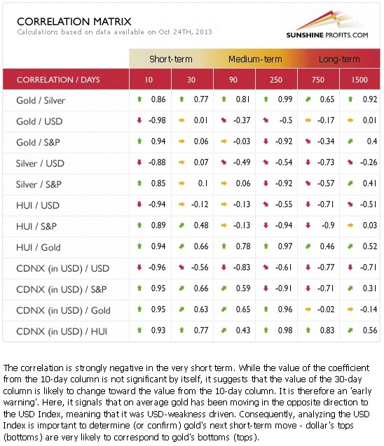 Overall, even though we could see some weakness on a short-term basis, the medium-term outlook is bullish for the general stock market and – as you will see in our Correlation Matrix the implications for gold are bearish for the medium term.