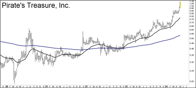 Although there is no publicly traded company called Pirate’s Treasure, the impressive price history displayed in the chart above is real enough. The Canadian company holds royalties to five gold mines that could conceivably rank among the largest in the world someday, according to ‘Spartacus’, a Rick’s Picks regular known for his street savvy, his encyclopedic knowledge of the mining world, and his insightful posts in the chat room. The stock is a classic ‘be right, sit tight’ winner, he says, and enviable profits will be made by investors patient enough to play the waiting game.