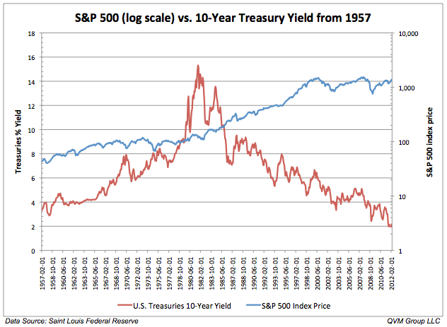 The concept suggests that the investible market works like a balanced fund; as money moves out of bonds, it moves into stocks. And of course, you could cherry pick cycles over the past few decades that would provide support for this opinion. For instance, the biggest rise in interest rates (fall in price) was from February 1978 to November 1980. During this time the yield on the Ten-Year Treasury rose from 8.04% to 12.80%, while stock market averages enjoyed a healthy gain.