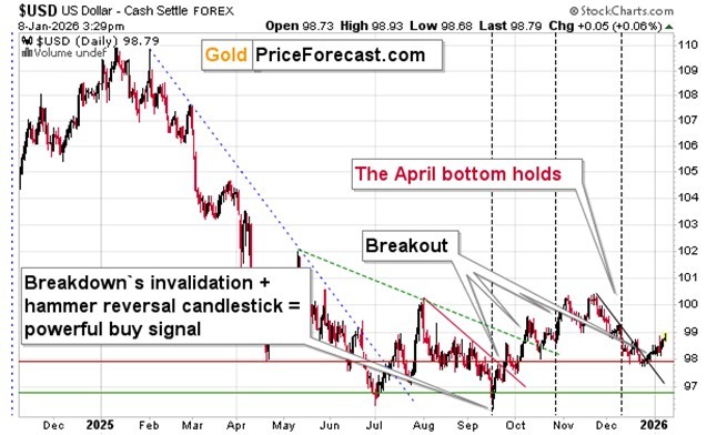 Zooming in reveals that the USD Index keeps on climbing. It’s been rallying since late December, and it’s up in 2026.
