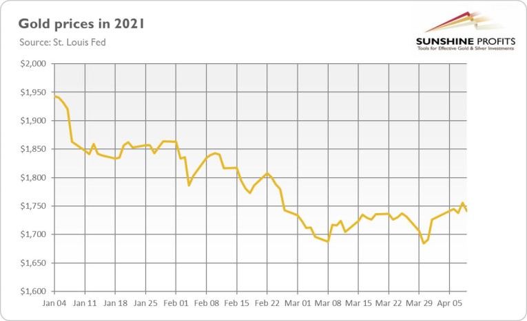 Indeed, the price of gold jumped shortly on Thursday (Apr. 8) above $1,750, as the chart below shows. This upward move was temporary, though, but that can change soon, as the inflation genie has popped out of the bottle.