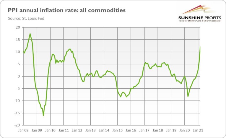 The Producer Price Index increased by one percent in March , twice more than in February, and significantly above the expectations of a rise of 0.4 percent. As well, the final demand index moved up 4.2 percent for the twelve months ended in March, the largest increase since September 2011. Meanwhile, the index for all commodities surged even more (12 percent!), in the fastest pace since the Great Recession, as the chart below shows. Importantly, the Consumer Price Index has also been rising recently (I will cover this report in the next edition of the Fundamental Gold Report).
