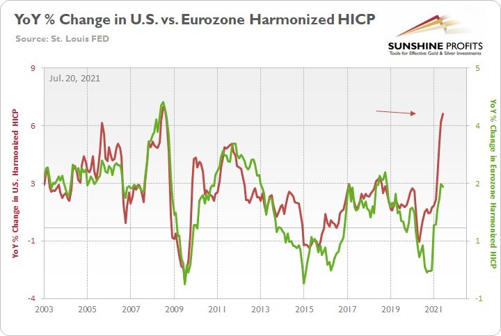 To explain, the green line above tracks the year-over-year (YoY) percentage change in the Eurozone Harmonized Index of Consumer Prices (HICP), while the red line above tracks the YoY percentage change in the U.S. HICP. If you analyze the right side of the chart, it’s not even close. And with the U.S. HICP rising by 6.41% YoY in June and the Eurozone HICP rising by 1.90%, the Fed is likely to taper well in advance of the ECB.