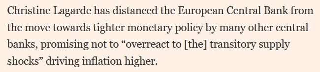 To that point, with the rhetoric above guiding the Fed down a hawkish path, the ECB is heading in the opposite direction. For example, ECB President Christine Lagarde said on Sep. 28 that there are “no signs that this increase in [Eurozone] inflation is becoming broad-based. The key challenge is to ensure that we do not overreact to transitory supply shocks that have no bearing on the medium term…. Monetary policy should normally ‘look through’ temporary supply-driven inflation, so long as inflation expectations remain anchored.”