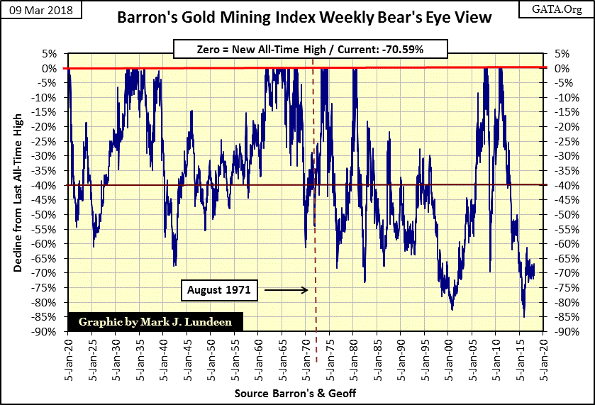 Looking first at the chart’s insert for 1920-70 we see the Dow Jones’ Roaring 1920s bull market, a bad time for the gold miners who took losses of 60% from 1920 to 1925. However, with the arrival of the Great Depression, the BGMI proved immune to the losses taken by just about everything else trading on the NYSE.