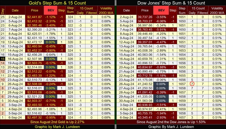 Not much has changed on gold’s side of the step sum table below. Thursday closed with gold just short of a new BEV Zero by only $4.60, just 0.18% away from gold’s last BEV Zero, a week ago, last Thursday. Then came Friday, where gold lost less than $20, which is no big deal.
