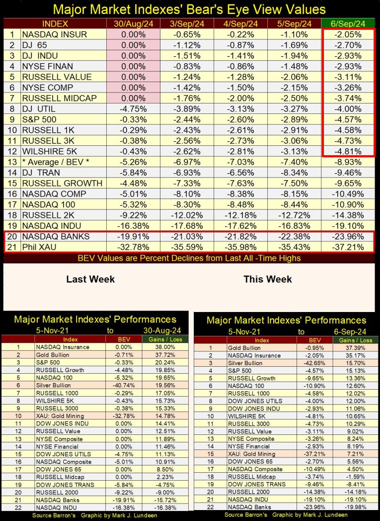 Looking at the BEV average for these indexes, #13 in the table, it went from -5.26% to -8.93% at the close of this week. That is a big move down, but nothing alarming when looking at this metric in the chart below. Keep in mind, this plot is the average of the BEVs for the major market indexes I follow. Unless they all close with a BEV Zero, you’ll never see this plot rise to a BEV Zero.