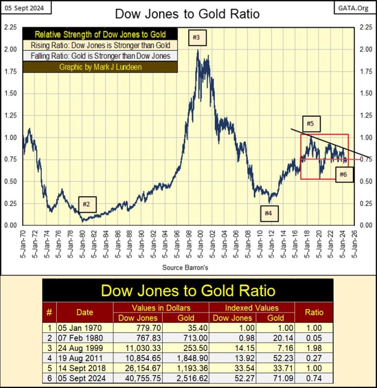 The table below the chart, lists the dates for the numbered boxes, as well as the values for the Dow Jones and gold, both dollar and indexed values, plus the value for the ratio. I didn’t include a box for #1 on the chart, for 05 January 1970, as the first day of the ratio, was by mathematical necessity; a 1.00 – the plot’s starting point. Including a box for the obvious made the chart appear clumsy.