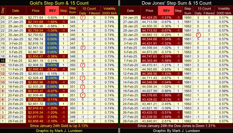 Taking a quick study of the Dow Jones’ side of the table above, we’re seeing what usually happens following a market becoming overbought, as with the Dow Jones’ +7 seen on January 30th. The market begins to correct for being overbought, by seeing declining days become as numerous, or actually overwhelm advancing days, exactly as seen above, for both gold and the Dow Jones.