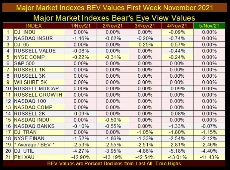However, to answer the question I asked above, the reason I use 05 November 2021 as a basis for my performance tables, is because on that Friday, fifteen of these major market indexes closed at a new all-time high, while the remaining indexes closed well inside scoring position; BEV ranging from -0.01% to -4.99%.