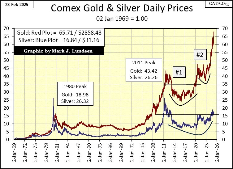 Next is a chart plotting gold and silver indexed to 1.00 = 02 January 1969. Indexing these market series allows us to follow them as in a horse race, and silver is far behind gold in this race. But this chart is wildly bullish for silver.