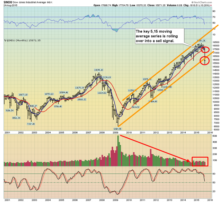 That’s a monthly chart of the Dow Industrials. The uptrend from the 2009 lows has been broken, and the key 5,15 moving average series is rolling over, ominously. I’m a buyer of the Dow only at 14,200, which is where massive buy-side horizontal support (HSR) begins.