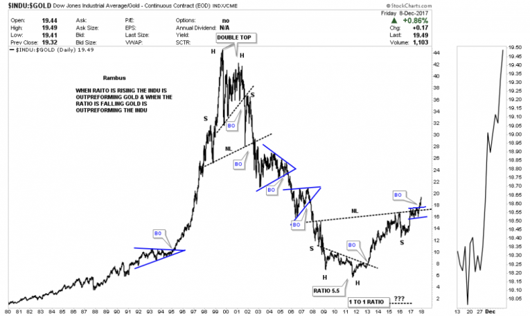 There are many gold investors that swear that the ratio has to go as low a 1 to 1 before the gold bull market is over. As you can see the ratio got as low as 5.5 in 2011 which is close enough IMHO especially since the price action that followed that double bottom low. There is a massive H&S bottom with the breakout underway. We have a very clear line in the sand for the staunch gold bulls which is the neckline. As long as the price action trades above that neckline the INDU is going to outperform gold.