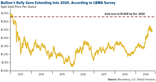 - According to delegates at the London Bullion Market Association (LBMA) annual conference, gold will rise to $1,658 an ounce by October 2020. Last years’ attendees “pretty much nailed” the metal’s rally in 2019, reports Bloomberg. The group also forecasts silver at $23 an ounce next year, rising 11 percent from today’s $17.60 level. Lastly, the attendees predict palladium will reach $1,924 an ounce by this time next year. Palladium is closing in on $1,800 an ounce as a supply deficit persists, according to Australia & New Zealand Banking Group.