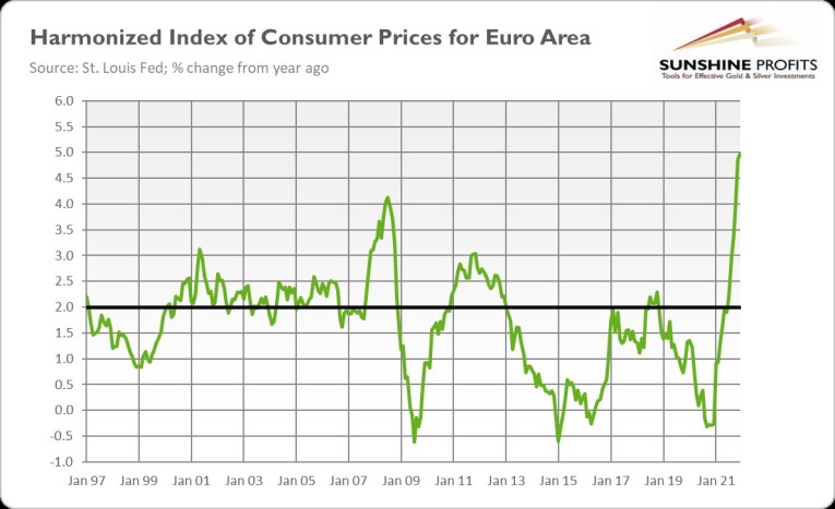 What does the latest ECB monetary policy meeting mean for the gold market? Well, maybe it wasn’t an outright revolution, but the ECB is slowly reducing its massive monetary stimulus. Although the euro area does not face the inflationary pressure of the same kind as the US, with inflation that soared to 5% in December and to 5.1% in January (according to the initial estimate), the ECB simply has no choice. As the chart below shows, inflation in the Eurozone is the highest in the whole history of euro.