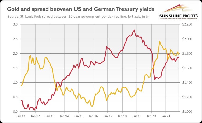 The narrowing divergence between monetary policies and interest rates in the US and in the Eurozone should strengthen the euro against the greenback – and it should be supportive of gold. As the chart above shows, when the spread was widening in 2012-2018, gold was in the bear market. The yellow metal started its rally at the end of 2018, just around the peak of the spread.