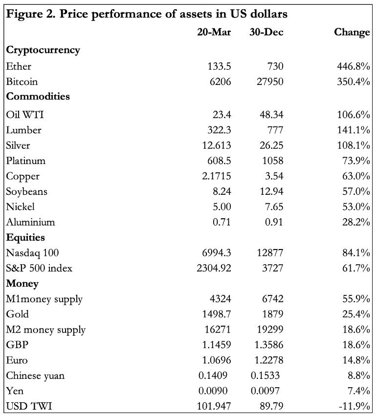 Ahead of the Fed’s March announcements, the performance of all three representatives was consistent with a slump in the economic outlook, with gold rising as a hedge against the economic impact. Following that turning point the consequences of monetary inflation became the dominant theme, and the dollar’s trade weighted index went into a decline. The effect on a wider list of assets is shown in Figure 2.