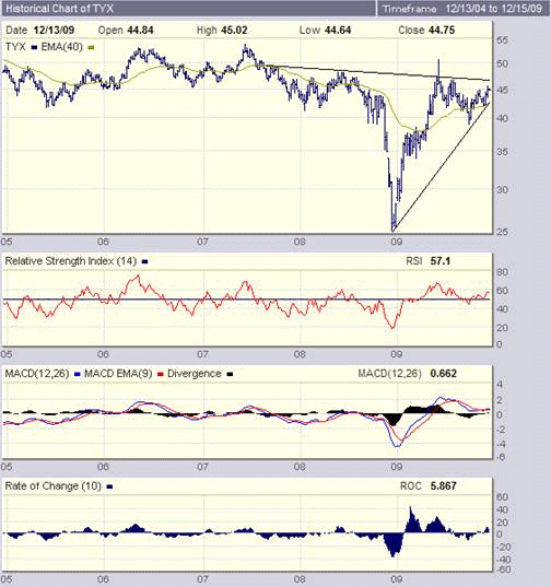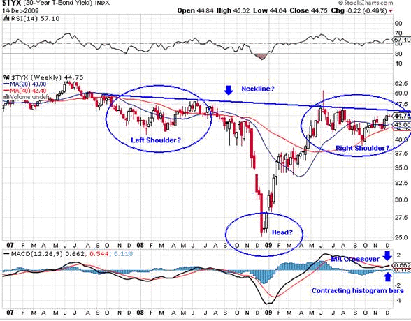 Below is a weekly bar chart of the 30 year bond yield in the US (courtesy Bigcharts.com). The yield may be thought of as the "price" that the market requires the US Government to pay if it wants to borrow money by issuing long dated Treasury Bonds.