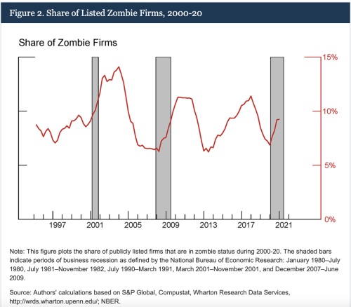 While the Fed brought up the concern that their cheap finance may cause a rise in zombie firms, the number of zombie firms has also been found to rise during periods of high inflation because businesses with tight margins struggle more to survive.…