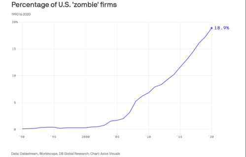 In the US zombie companies are estimated to control 2.2 million jobs and have built up $2 trillion of debt over the pandemic, nearly $500 billion higher than the peak of the Great Recession. These are not just small firms either, with an analysis by Deutsche Bank Securities identifying nearly one in every five publicly traded U.S. companies as a zombie, double the number in 2013. They include iconic brands such as Macy’s, Boeing, Carnival, Delta Air Lines, Exxon Mobil and Marriott International.