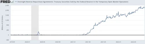 Whatever line of future defense this historical massive pile of reverse repos may be intended to provide, Jamie Dimon still sounded plenty worried with his original overnight flip from sunny skies as far as the eye can see to hurricane warnings (from which he recently halfway re-flipped). Should there be any banks that did not have the foresight to lay in a lot of reverse repos as loans to the Fed in exchange for bonds as collateral when they had too much cash, I would think those might be the first banks to falter during this new QT phase. As you can see from the graph, we’re in uncharted territory. Here’s a view over a wider expanse of time to make clear what this reverse-repo anomaly looks like by historic comparison: