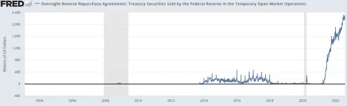 The Fed appears to have pumped a lot of slack into the system, but no one has ever seen how this kind of slack plays out either. The Fed stacked in a tremendous amount of the exact opposite of repo loans — reverse repo loans, whereby it took excess cash out of bank reserves and replaced it with bonds as collateral. I noted last year that the Fed was taking money out the back door almost as quickly as its continuous QE was creating it. It had to do this because there was too much cash sloshing around from all the Fed’s excess liquidity, leaving me to wonder why they were even creating so much liquidity that they had to remove it in this clandestine fashion. I suggested maybe they were banking it as slack for when they started to tighten, should the need it. That money taken out of bank reserves on loan that can go immediately back has piled up like this: