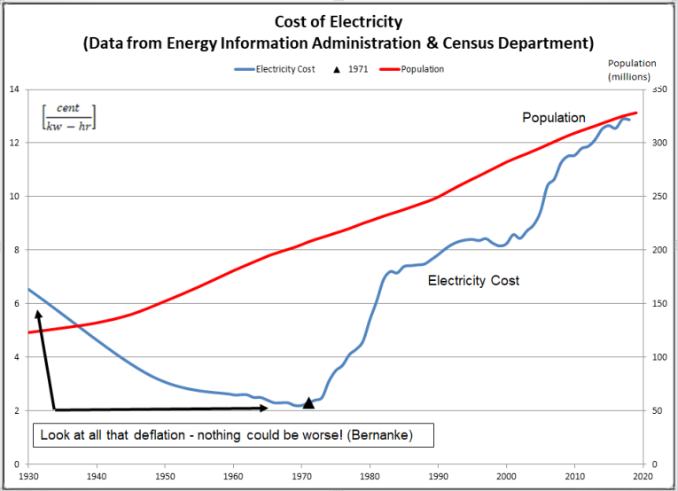 At this point it is worth nothing, that there is no ideal rate of positive inflation. In fact, a healthy economy - by virtue of productivity enhancing capital investments - produces lower prices! The best example of this is provided by the price of electricity. For decades - from the 1920s into the 1970s - the price of electricity fell! The price fell even as the use of electricity expanded and society become increasingly dependent on it. See Figure 1.