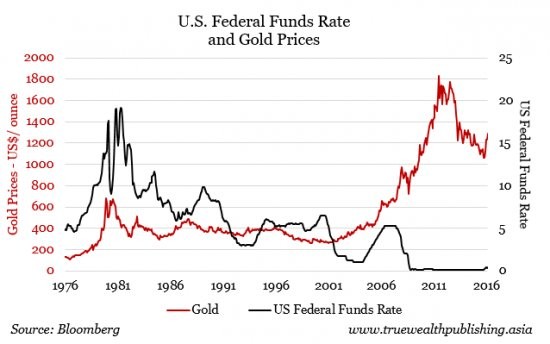 According to international pundit Kim Iskyan, “Gold is falling because of the Fed — but not for the reason you think.” Ms Iskyan goes on to clarify: “Gold investors can stop worrying. Despite recent chatter, interest rate tinkering at the Federal Reserve is not driving the price of gold. Actually, the Fed doesn’t have much pull on gold. But the US dollar does. The chart below demonstrates that overall, gold does not necessarily go one way or another when the Fed raises rates.