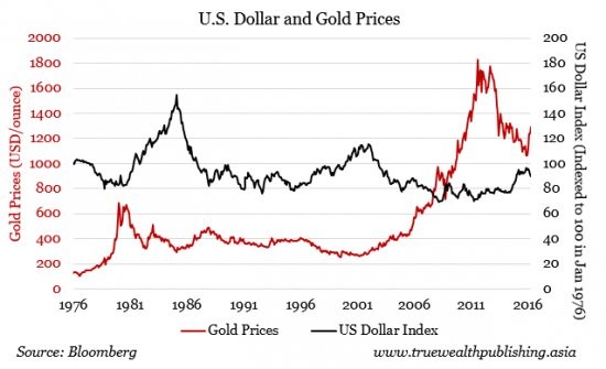 And, as the US Dollar climbed 37 percent from April 2011 to November 2015, gold prices were weak, falling 32 percent.”