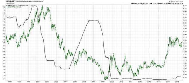 The Chart below shows the Fed Funds Rate vs the value of the US Dollar Index from 1998 to the present. In general they run in tandem, i.e. Fed Funds Rate over time drives the value of the greenback.