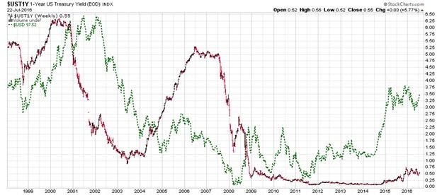 One-Year US Treasury Yield vs US Dollar