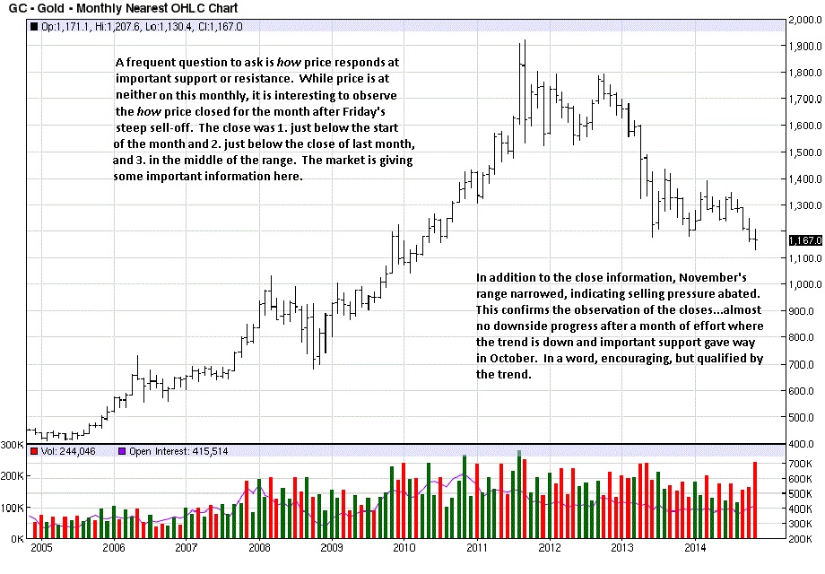 We cannot know how December will unfold, nor should we care, but we can extract a few observations that suggests a slowing of the downward pace. The chart observation may not always lead to a trade, and certainly not from a monthly time frame, but there is a context for what may develop that can eventually lead to a trade on a lower time frame.