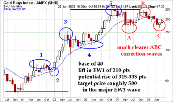 In late 2000, the newborn Goldbug Unhedged Index HUI put in a low of 40. In December 2003, the HUI registered a high of 250. That means we had a 210 point rise in the major Elliott Wave #1 upleg. Typically, the EW3 third upleg is 50% to 60% larger than the EW1 upleg. That translates to 315 to 335 points of potential power in the virtuous major EW3 upleg, to a level bounded by 495 and 515 in the index. The textbook three impulse moves up have been loosely conformed to the rules, seen over the past three years. The textbook two impulse moves down seem to have been completed in rather clear form. The 180 level might prove to be the starting point for the major EW3 wave, since it has survived a retest. Regardless, we appear to be headed to 500 in the future, according the Elliott Wave guidelines. Profits in miner stocks will be obscene.