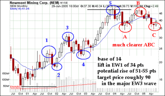 In late 2000 Newmont Mining, the largest among the HUI indexed member stocks, put in a low of 14. In December 2003, the NEM share price registered a high of 48. That means we had a 34 point rise in the major Elliott Wave #1 upleg. Typically, the EW3 third upleg is 50% to 60% larger than the EW1 upleg. That translates to 51 to 55 points of potential power in the virtuous major EW3 upleg, to a level bounded by 88 and 92 in the index. The textbook three impulse moves up have been loosely conformed to the rules, seen over the past three years. The textbook two impulse moves down seem to have been completed in rather clear form. The 37 level might prove to be the starting point for the major EW3 wave, since it has survived a retest. Regardless, we appear to be headed to 90 per share in the future. According the Elliott Wave guidelines, profits in the gold miner flagship stock will be obscene.
