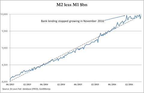 After a long period of subdued growth, there are now signs that the US economy is suffering from overall debt fatigue. Bank lending is stalling, as the chart below of US M2 minus M1 money supply shows.