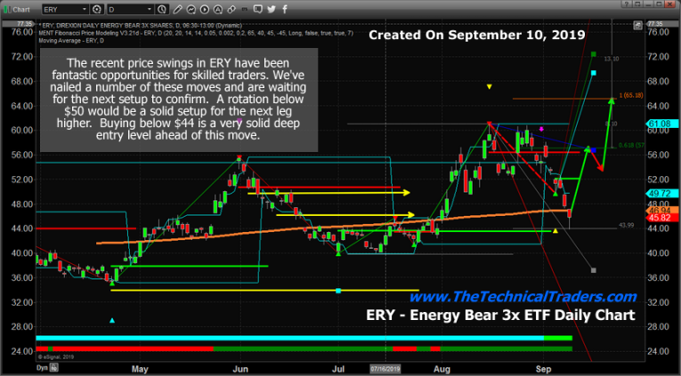 Sometimes, it pays to be lucky and skilled when deploying technical analysis and price theory. We caught an early move in ERY back in June 2019 for a nice profit. Then watched as price fell back towards the $44 price level – expecting another base/bottom setup to form. On September 12, 2019, we issued a research post suggesting to our followers that ERY is reaching a key low point and that traders should start looking for the next move (see below). We had no idea that Yemen would launch a drone attack on Saudi Arabia crippling their oil production capacity within 5 days of that research post. All we knew was that ERY was moving back towards a historical low price level that would present another opportunity for skilled traders – an opportunity for profits.