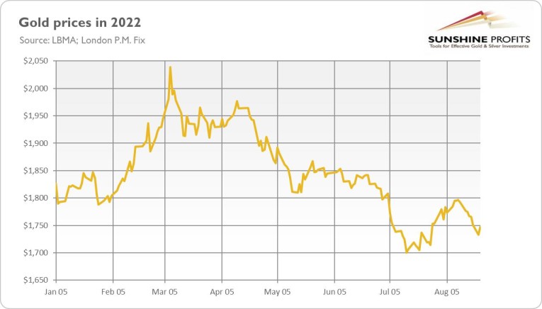 However, from the fundamental point of view, the slowdown in economic activity should be positive for gold prices. It brings us closer to stagflation and increases the odds of a more dovish Fed in the future.
