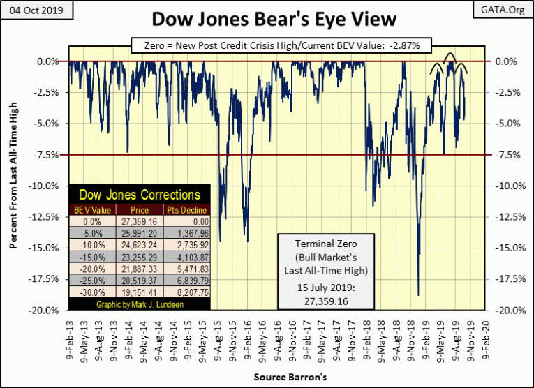 The best illustration for that is my Bear’s Eye View (BEV) chart of the Dow Jones from 1885 to 2019. What’s a BEV chart? It’s a view of the Dow Jones as Mr Bear sees it, with each new all-time high registering only a 0.00%, (aka; BEV Zero or Big Fat Zero as Mr Bear calls them) and each daily closing price NOT a new all-time high is registered as a percentage claw back from its last BEV Zero.