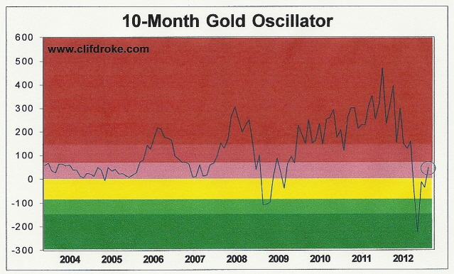 A final consideration is in order as we examine the case for and against a continuation of the gold rally. Earlier this summer we looked at the important 10-month price oscillator for gold and saw that it was flashing an historic "oversold" reading. This implied that a potentially major bull market leg would occur in the near future. This of course was fulfilled, at least in part, during the late summer rally. As of October, the 10-month oscillator has rebounded rather sharply from its previous "oversold" reading, yet it also remains well below the bearish "red zone" as you can see here.